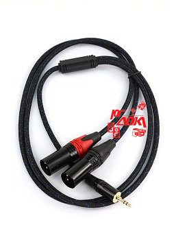 аудио Y-кабель jack 3.5 -> 2 x XLR, проводник из бескислородной меди(OFC), структура проводника 20x0.12мм, площадь сечения проводника 0.23мм² 24AWG, изоляция проводника из полиэтилена (PE) Ø2мм, плотный витой экран из бескислородной меди(OFC), структура экрана 84x0.1мм, прочная и гибкая внешняя изоляция из поливинилхлорида(PVC) с нейлоновой оплеткой, позолоченные контакты разъемов Длина кабеля: 1 м.; Длина разъединенной части: 0,8 м.