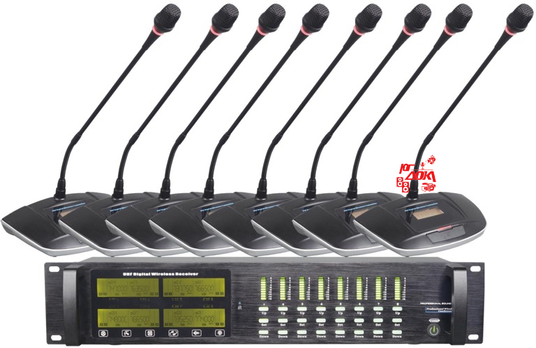 Беспроводная дискуссионная радиосистема, комплект из 8 настольных микрофонов и многоканального приёмника. Диапазон несущей частоты - UHF (760-830 мГц). Оснащена системой автоматического поиска свободной частоты передачи и синхронизации пары приёмник-передатчик. Приёмник оснащён как восемью независимыми выходами (для каждого настольного микрофона в отдельности), так и одним общим. Допускается одновременное использование до двух систем USC-101T.