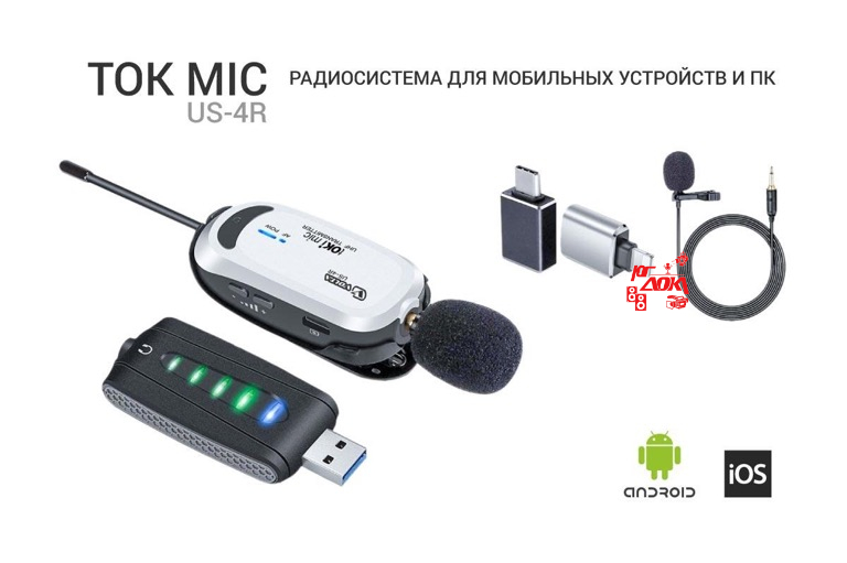 Микрофонная радиосистема для мобильных устройств и ПК, 2 типа микрофонов, входящих в комплект поставки – адаптированный сверхкомпактный конденсаторный микрофон для использования передатчика в качестве ручного микрофона и петличный микрофон. Двадцать автоматически выбираемых несущих частот. Приёмник системы выполнен в виде USB-flash card. Для работы с мобильными устройствами в комплекте USB адаптеры на USB-C и Lightning.
