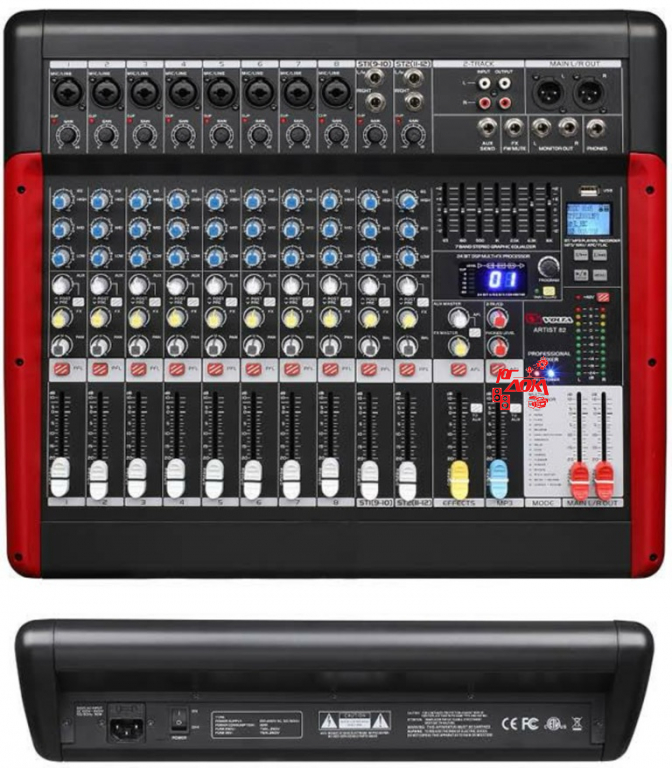 Профессиональный микшерный пульт. 8 мик\линейных входов + 2 стерео входа, встроенный медиа плеер, цифровой 24-bit процессор эффектов, общий графический эквалайзер.