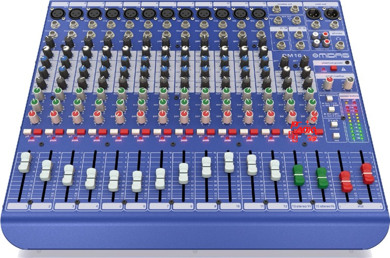 микшерный пульт 16 каналов, 12 моно-входов с предусилителями Midas, 2-стерео-входа, 2 шины AUX