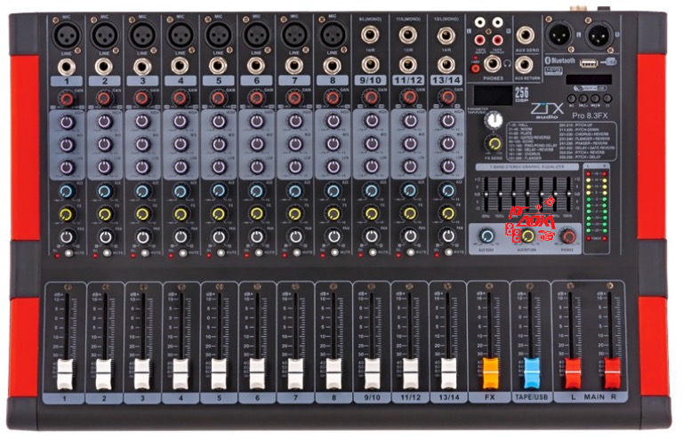 Микшерный пульт 8 mic/line с фантомным питанием 48V, 3 stereo канал, MP3 проигрыватель USB , Bluetooth, Внутренний цифровой эффект 256 программ. AUX, 5 полосный эквалайзер на main канал и 7 полосные эквалайзеры на Mic/Line и stereo входы. USB-интерфейс для подключения к компьютеру Питание: адаптер 12V