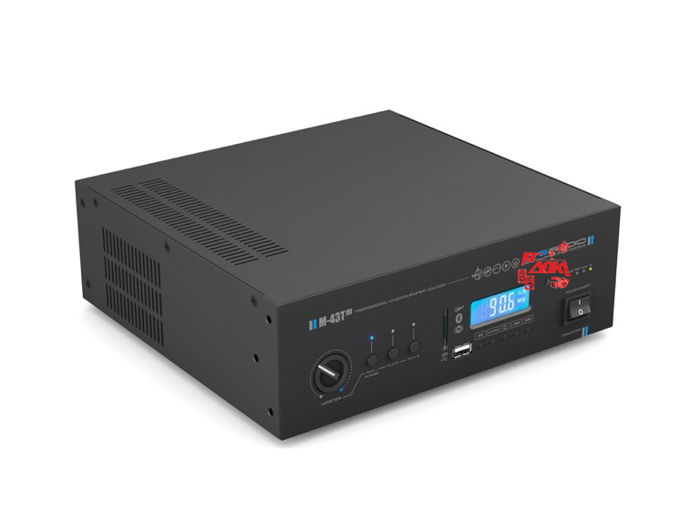 Профессиональный микшер-усилитель c встроенным модулем источника сигнала (MP3/FM/Bluetooth) для качественных систем трансляции фоновой музыки и оповещения, 40W/100V, 3 line in, 2 mic/line in (настраиваемый приоритет), управляющие контакты FULL MUTE, MUSIC MUTE, раздельный EQ для линейных и микрофонных входов, mini case