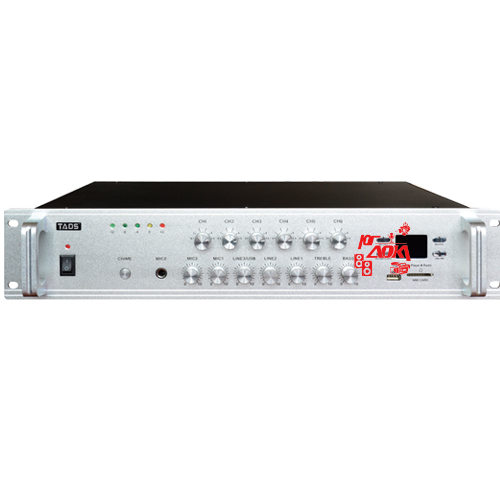 Встроенный Bluetooth, MP3-плеер, разъем USB, слот для SD-карты и FM приемник. Два микрофонных входа, микрофон 1 оснащен функцией отключения звука. Регуляторы высоких и низких частот на выходном канале. Три линейных входа. 6 зональный селектор. 6 отдельных зональных регуляторов громкости. Номинальная выходная мощность: 700 Вт. Частотная характеристика: 60 Гц-16 кГц +/- 2 дБ. THD (общие гармонические искажения): 0,1% (1 кГц 0 дБ). Отношение сигнал/шум микрофон: 66 дБ. Отношение сигнал/шум линия: 102 дБ. Чувствительность микрофонного входа: -50 дБ/600 Ом. Чувствительность линейного входа: -10 дБ/10 кОм. Питание: 220 В /50 Гц. Размер: 480 х 370 х 88мм. Вес: 22 кг.