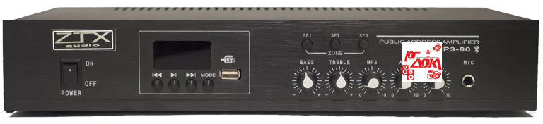 трансляционный усилитель мощности 80W, 3 зоны, 1 микрофонный вход, 1 линейный вход/AUX, 1 линейный выход, USB/BLUETOOTH/MP3/FM регулировка высоких и низких частот защита от перегруза.