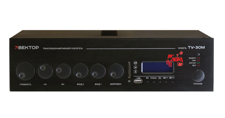 Компактный комбинированный микшер-усилитель. Мощность 30Вт. Выход 100В\4-16Ом, 1 микр и 2 AUX входа, 1 AUX выход. Цифровой FM тюнер, MP3 плеер, USB, SD, Bluetooth. Питание 220В. Размеры 330 х 88 х 250 мм. Вес 3.8 кг.