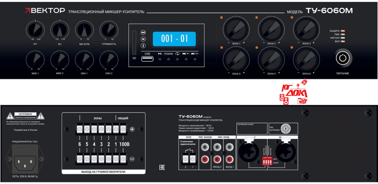 Комбинированный микшер-усилитель, 6 зон c регулировкой уровня выходного сигнала. Мощность 350 Вт /100В. 2 микр, с фантомным питанием и выбором приоритета 2 лин входа, 1 Aux вых. Цифровой AM\FM тюнер, MP3 плеер,ИК-пульт в комплекте. Функция аварийного отключения. Питание 220В. Рэковое крепление в комплекте. Размеры 482х88х400 мм. Вес 16,5 кг.
