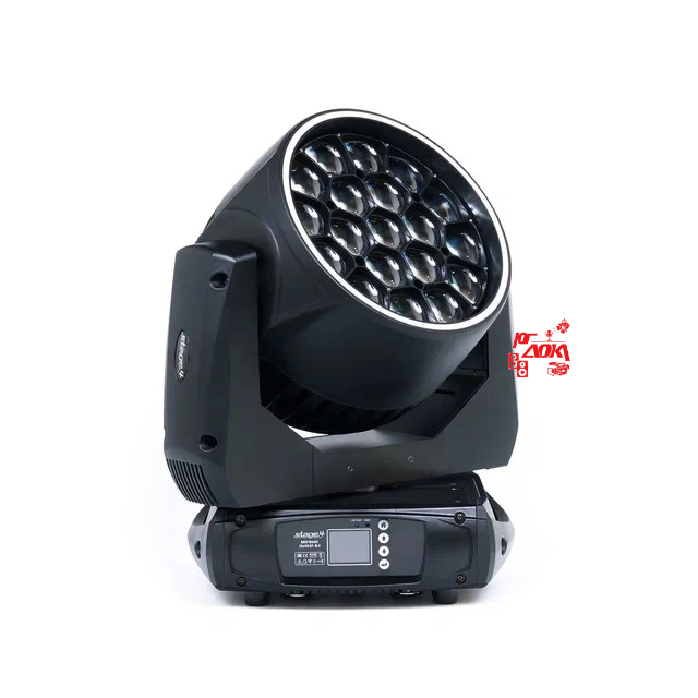 Поворотная "голова" типа WASH / LED 19x40 Вт RGBW 4-в-1 / Электронный линейный зум 6-60° / Индивидуальное управление светодиодами / Линейный диммер 0-100% / Стробоскоп / CTO и CTB / Цветовая температура 2700К-8000К / Светодиодное кольцо