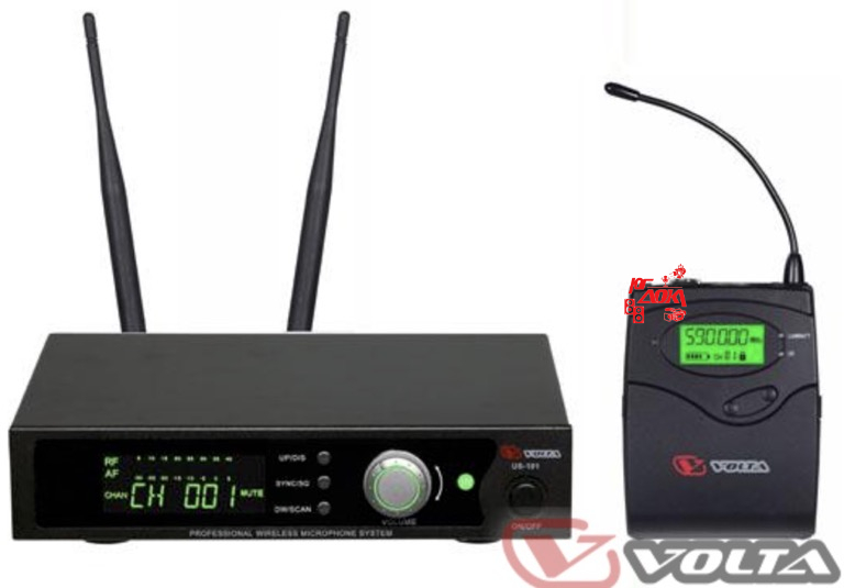 VOLTA US-101H with aluminuim case (592-611.8MHz) Микрофонная 100-канальная радиосистема с головным микрофоном UHF диапазона . PLL-synthes, LCD-дисплей, True Diversity, 1/2 19" рэк, алюминиевый кейс. В состав комплекта входит петличный микрофон.