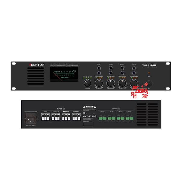 Усилитель мощности класса "D": 4 канала по 120 Вт/100 В, 70 В. Линейные вход /выходы, (разъем тип Phoenix). Индикация режимов работы усилителя. Регулировка уровня выходного сигнала, регулировка НЧ/ВЧ, многоступенчатая защита. Питание 220-230 В/50-60 Гц. Высота 2U.