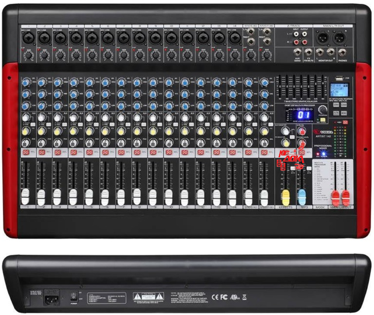 Профессиональный микшерный пульт. 14 мик\линейных входов + 2 стерео входа, встроенный медиа плеер, цифровой 24-bit процессор эффектов, общий графический эквалайзер.