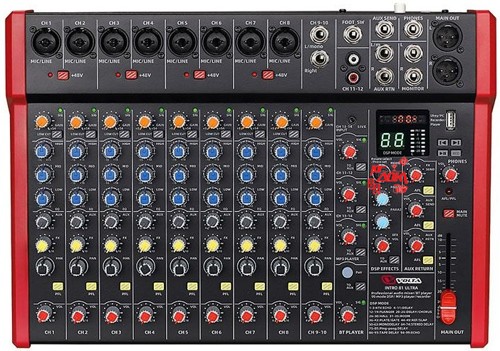 Компактный микшерный пульт INTRO 41 предназначен для использования в небольших звукоусилительных комплектов для смешения сигналов от различных источников, например – микрофонов или музыкальных инструментов. Конструкция пульта позволяет одновременно использовать 4 монофонических микрофонно-линейных входа и 1 стереофонический линейный вход. Моно входы можно использовать для прямого подключения музыкальных инструментов с большим сопротивлением. Главной особенностью микшера INTRO 41 является многоформатный аудио плеер, позволяющий воспроизводить файлы с USB-Flash карты или через Bluetooth. Кроме того, микшер можно использовать в качестве рекордера. Кроме того, в микшерах серии INTRO использованы балансные выходы с разъёмами XLR. Данный пункт практически не используется в данной категории товаров, но заметно улучшает пользовательские и технические характеристики. Микшерный пульт INTRO 41 может с успехом применяться в составе звуковых комплектов в презентационных системах, системах фонового озвучивания, репетиционных комнатах, детских учреждениях.
