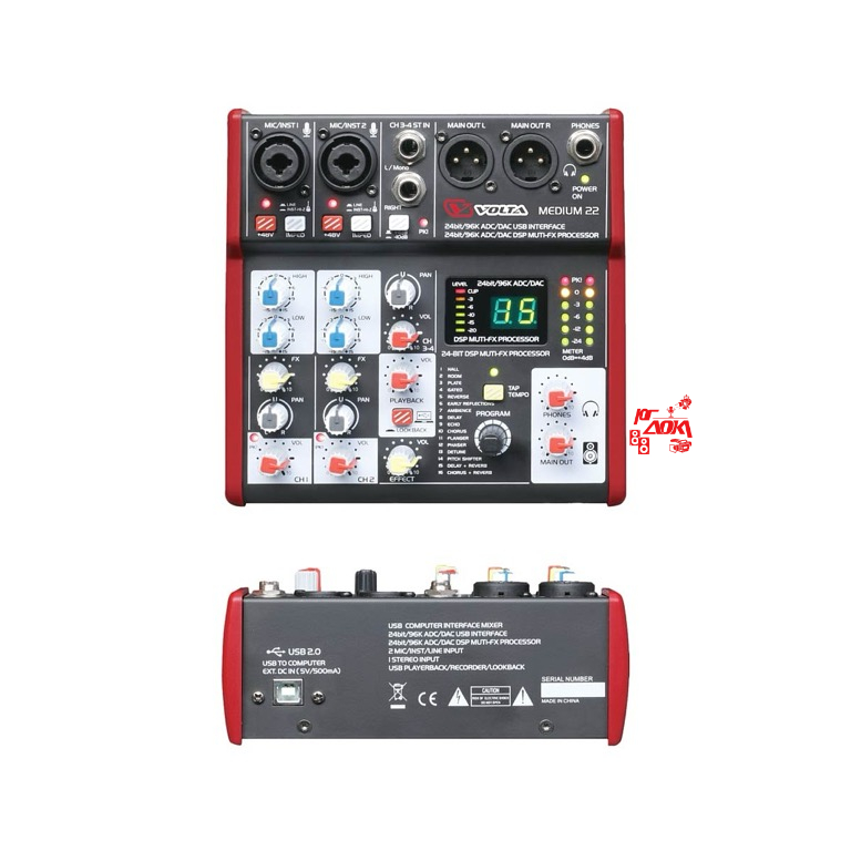 Микшерный пульт и внешняя звуковая плата. 2 входных канала с микрофонно- инструментальными предусилителями и одна стереопара. Секция аудиоинтерфейса основана на 24-битном процессоре. Подключение к ПК осуществляется через разъём USB типа В. Микрофонно-инструментальные предусилители оснащены индивидуальными включателями фантомного питания, 2-полосным эквалайзером, регулятором стереопанорамы и посылом на встроенный процессор эффектов. FX- процессор имеет 24-битную разрядность, 16 заводских базовых алгоритмов и клавишу Tap Tempo.Электропитание осуществляется либо от ПК, либо от внешнего блока питания, входящего в комплект поставки.