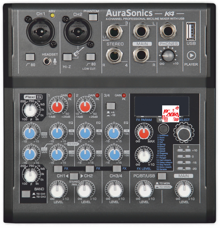 компактный микшерный пульт 2 мик.+1 лин.стерео+FXстерео+дополнительный стереоканал со встроенных источников Bluetooth/PC-Audio/USB-плеер, параметрический эквалайзер FlexiEQ