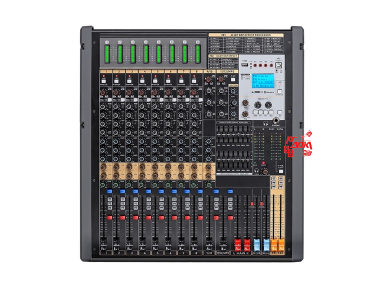 Микшерный пульт, 8 каналов, 8 входов MONO и XLR, 4 стереовхода. Каждый моноканал с светодиодным индикатором уровня выходного сигнала. Клавиша PAD на каждом канале. Отдельно стоящий выключатель питания 48 В на каждом канале. Функция FREQ на каждом канале. 3 выхода AUX. Встроенные два DSP-эффектора, один EFF с 24 видами DSP для настройки голоса, другой с 8 видами DSP для настройки инструментов. Кнопка MUTE на каждом канале. Кнопка монитора на каждом канале. Фейдер 100 мм. MP3 с тремя настройками эквалайзера и регулировкой усиления. Встроенная звуковая карта может напрямую подключаться к ПК. MP3-плеер с подключением Bluetooth и функцией записи. 2,5-дюймовый матричный экран. Двойной 7-полосный эквалайзер на главном стерео выходе. Стерео выход и четыре групповых выхода. Размеры: 470 х 495 х 155 мм. Вес: 7,65 кг.