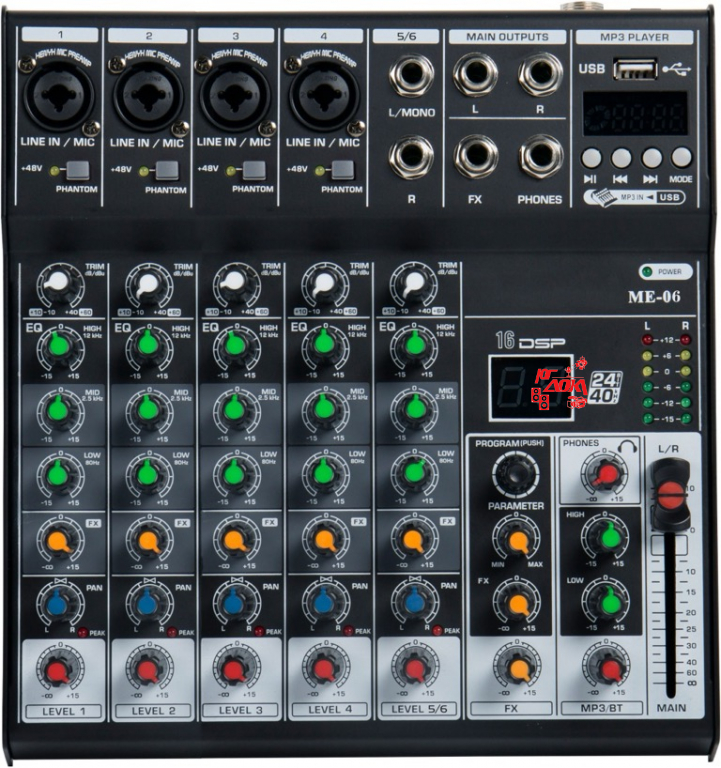 Микшерный пульт, 6 каналов, серия PRO, Цифровой дисплей, запись MP3, Bluetooth подключение. Вход с комбинированным разъемом XLR и LINE. Усиление, 3-полосный эквалайзер, регуляторы Aux и FX, PAN на каждый канал. Процессор цифровой обработки аудиосигнала. Фантомное питание +48 В. Запись и воспроизведение в балансном и небалансном режимах.