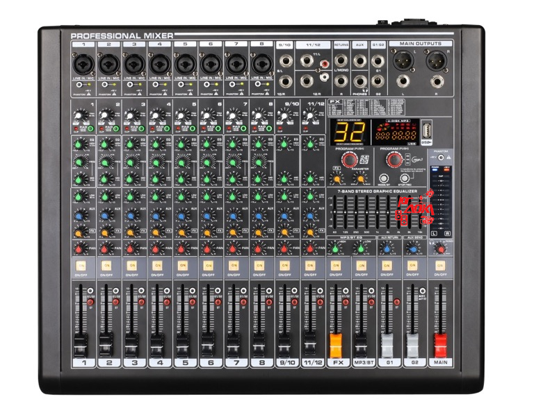 Микшерный пульт, 12 каналов, серия PRO, Профессиональный микшер среднего размера с ультра-малошумящим дискретным микрофонным предусилителем и фантомным питанием 48 В. 8 комбинированных разъемов Line/Mic, стереовход RCA/6,35мм. Выход aux, основной стереовыход, выход на наушники, выход эффекта. 60-мм высокоточный фейдер. Встроенный MP3-плеер, поддержка USB. Подключение Bluetooth и функция записи MP3 через USB. Вставьте USB для воспроизведения музыки или для записи, подключите мобильный телефон к микшеру с помощью Bluetooth соединения. Расширенный эффектор: содержит 99 наборов предустановленных эффектов. 9-полосный графический эквалайзер. Переключатели PAD и Mute для всех моноканалов. Балансный выход XLR.