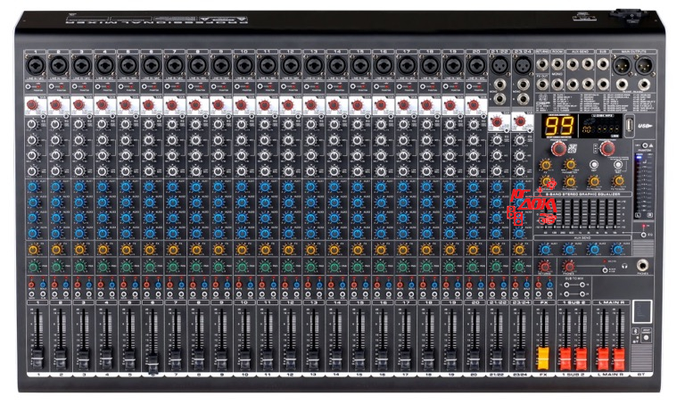 Микшерный пульт, 24 канала, серия PRO, Профессиональный микшер с ультра-малошумящим дискретным микрофонным предусилителем и фантомным питанием 48 В. 20 комбинированных разъемов Line/Mic, стерео входы Line. Выход aux, основной стереовыход, выход на наушники, выход эффекта. 60-мм высокоточный фейдер. 3-х полосный эквалайзер канала. Встроенный MP3-плеер, поддержка USB. Подключение Bluetooth и функция записи MP3 через USB. Вставьте USB для воспроизведения музыки или для записи, подключите мобильный телефон к микшеру с помощью Bluetooth соединения. Расширенный эффектор: содержит 99 наборов предустановленных эффекторов. 9-полосный графический эквалайзер. Переключатели Solo и Mute для всех моноканалов.