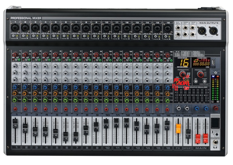 Микшерный пульт, 16 каналов, Профессиональный микшер среднего размера с ультра-малошумящим дискретным микрофонным предусилителем и фантомным питанием 48 В. 16 комбинированных разъемов Line/Mic. Выход aux, основной стереовыход, выход на наушники, выход эффекта. 60-мм высокоточный фейдер. 3-х полосный эквалайзер канала: HIGH: 12 кГц ±15 дБ; MID: 3 кГц ±15 дБ; LOW: 80 Гц ±15 дБ. Встроенный MP3-плеер, поддержка USB. Подключение Bluetooth и функция записи MP3 через USB. Вставьте USB для воспроизведения музыки или для записи, подключите мобильный телефон к микшеру с помощью Bluetooth соединения. Расширенный эффектор: SPX, содержит 16 наборов предустановленных эффекторов. 7-полосный графический эквалайзер. Переключатели PAD и Mute для всех моноканалов. Балансный выход XLR. Размеры: 525 x 120 x 415 мм.