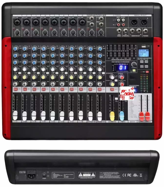 Микшерный пульт 8 моно+2 стерео+ 2 AUX, Bluetooth, MP3 Player /Recorder, 60мм фейдеры, 3 полосный EQ на каждом канале, 2-Track, 7-полосный общий EQ, 24бит DSP эффект процессор. Вес 4.45кг.