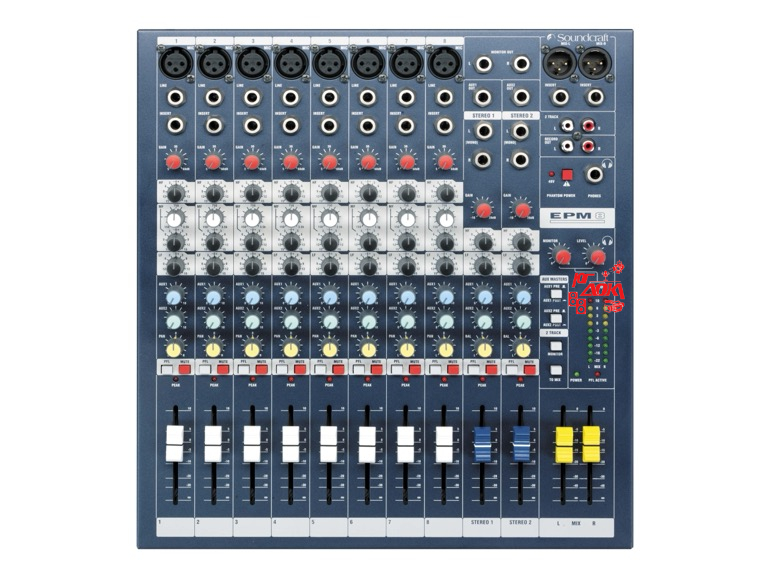 Микшерный пульт, 8 моно + 2 стерео, 2 переключаемых аукса. Фейдеры 60 мм. Моно-вход: разъёмы XLR и jack, инсерт-jack, 3-полосный EQ с параметрической серединой. Стерео-вход: разъёмы jack, 2-полосный EQ. Входы tape-in и выходы записи на RCA. Инсерты в мастер-выходе.