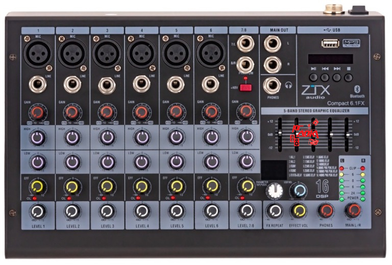 Микшерный пульт 6 mic/line с фантомным питанием 48V, 1 stereo канал, MP3 проигрыватель USB, Bluetooth, Внутренний цифровой эффект 16 программ. 5 полосный эквалайзер на main канал и 2 полосные эквалайзеры на Mic/Line и stereo входы. Питание: адаптер 12V