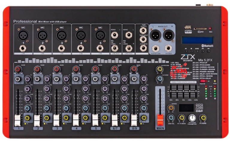 Микшерный пульт 5 mic/line с фантомным питанием 48V, 2 stereo канал, MP3 проигрыватель USB или SD cart с возможностью записи мастер канала, Bluetooth, Внутренний цифровой эффект 256 программ. 5 полосный эквалайзер на main канал и 3 полосные эквалайзеры на Mic/Line и stereo входы. Питание: адаптер 12V