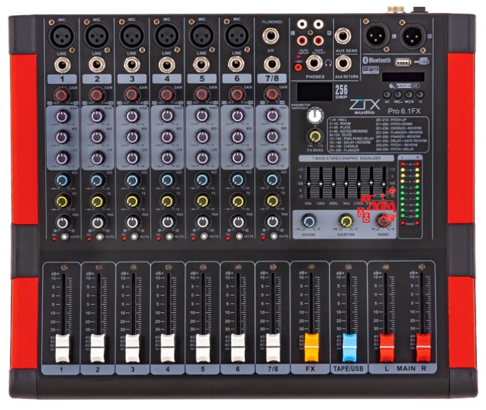 Микшерный пульт 5 mic/line с фантомным питанием 48V, 1 stereo канал, MP3 проигрыватель USB , Bluetooth, Внутренний цифровой эффект 256 программ. AUX, 5 полосный эквалайзер на main канал и 7 полосные эквалайзеры на Mic/Line и stereo входы. USB-интерфейс для подключения к компьютеру Питание: адаптер 12V