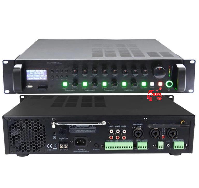 Усилитель мощности трансляционный, 120Вт, Установка в стандартный рэк. Подключение Bluetooth, USB/SD проигрыватель (форматы MP3, WMA, WAV, FLAC, AAC и другие). 4 отдельных зональных регуляторов громкости. 2 микрофонных, 2 линейных и 1 комбинированный вход с контролем громкости. Индикация уровня сигнала. При нажатии кнопки звукового сигнала, выбранный звуковой сигнал звучит в качестве предварительного перед объявлением. Двухполосный эквалайзер +/- 12 дБ. Микрофонные комбинированные разъемы XLR/6.3мм. Фантомное питание входов Mic 1 и 2. Оснащен защитой от короткого замыкания, перегрева и перегрузки, ограничитель тока.