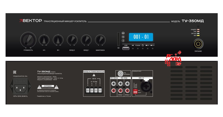 Комбинированный микшер-усилитель класс D. Мощность 350Вт. Выход 100В\4-16Ом, 1 микр и 2 AUX входа, 1 AUX выход. Цифровой FM тюнер, MP3 плеер, USB, SD, Bluetooth. Питание 220В. Рэковое крепление в комплекте.
