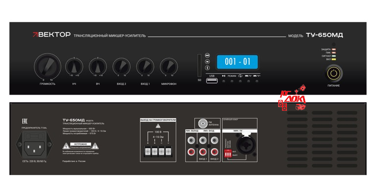 Комбинированный микшер-усилитель класса D. Мощность 650Вт. Выход 100В\4-16Ом, 1 микр и 2 AUX входа, 1 AUX выход. Цифровой FM тюнер, MP3 плеер, USB, SD, Bluetooth. Питание 220В. Рэковое крепление в комплекте.