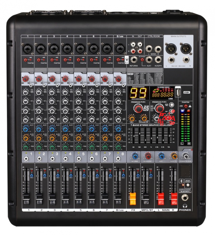 Микшерный пульт активный, 8 каналов, серия PRO, Малошумящий микрофонный предусилитель и фантомное питание 48 В. 8 комбинированных разъемов Line/Mic. Выход aux, основной стереовыход, выход на наушники, выход эффекта, стерео вход/выход RCA. Высокоточный фейдер. 3-х полосный эквалайзер канала. Встроенный MP3-плеер, поддержка USB. Подключение Bluetooth. Расширенный эффектор: содержит 99 наборов предустановленных эффекторов. 7-полосный графический эквалайзер. Переключатели Solo и Mute для всех моноканалов. •Пиковая мощность 2 х 350Вт•RMS мощность 2 х 300Вт при сопротивлении 4Оm