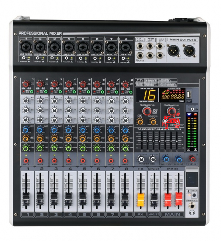 Микшерный пульт, 8 каналов, Профессиональный микшер среднего размера с ультра-малошумящим дискретным микрофонным предусилителем и фантомным питанием 48 В. 8 комбинированных разъемов Line/Mic. Выход aux, основной стереовыход, выход на наушники, выход эффекта. 60-мм высокоточный фейдер. 3-х полосный эквалайзер канала: HIGH: 12 кГц ±15 дБ; MID: 3 кГц ±15 дБ; LOW: 80 Гц ±15 дБ. Встроенный MP3-плеер, поддержка USB. Подключение Bluetooth и функция записи MP3 через USB. Вставьте USB для воспроизведения музыки или для записи, подключите мобильный телефон к микшеру с помощью Bluetooth соединения. Расширенный эффектор: SPX, содержит 16 наборов предустановленных эффекторов. 7-полосный графический эквалайзер. Переключатели PAD и Mute для всех моноканалов. Балансный выход XLR. Размеры: 385 x 120 x 415 мм.
