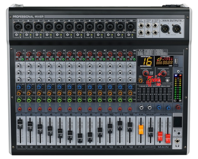 Микшерный пульт, 12 каналов, Профессиональный микшер среднего размера с ультра-малошумящим дискретным микрофонным предусилителем и фантомным питанием 48 В. 12 комбинированных разъемов Line/Mic. Выход aux, основной стереовыход, выход на наушники, выход эффекта. 60-мм высокоточный фейдер. 3-х полосный эквалайзер канала: HIGH: 12 кГц ±15 дБ; MID: 3 кГц ±15 дБ; LOW: 80 Гц ±15 дБ. Встроенный MP3-плеер, поддержка USB. Подключение Bluetooth и функция записи MP3 через USB. Вставьте USB для воспроизведения музыки или для записи, подключите мобильный телефон к микшеру с помощью Bluetooth соединения. Расширенный эффектор: SPX, содержит 16 наборов предустановленных эффекторов. 7-полосный графический эквалайзер. Переключатели PAD и Mute для всех моноканалов. Балансный выход XLR. Размеры: 485 x 120 x 415 мм.