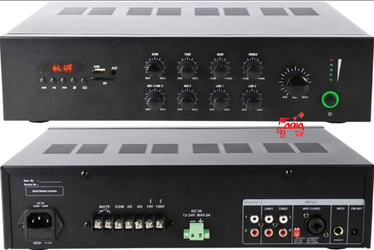 Усилитель мощности трансляционный, 120Вт, Подключение Bluetooth, USB/SD MP3 проигрыватель и FM-тюнер. Микрофонный и комбинированный микрофон/линя вход с контролем громкости. Два линейных входа RCA. Эффект эха и задержки. Двухполосный эквалайзер. Индикация уровня сигнала.