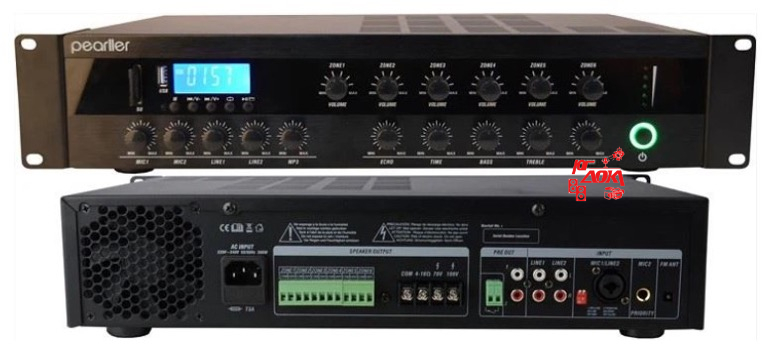Усилитель мощности трансляционный, Установка в стандартный рэк. Подключение Bluetooth, USB/SD проигрыватель. 6 отдельных зональных регуляторов громкости. Индикация уровня сигнала. Двухполосный эквалайзер. Регуляторы громкости MIC1 и 2, Line1 и 2, mp3. Комбинированный вход XLR/6.3мм. Выходная мощность (RMS): 180 Вт. Частотная характеристика микрофон: 200 Гц - 18 кГц. Частотная характеристика линия: 100 Гц - 19 кГц. Коэффициент нелинейных искажений при 1 кГц: менее 1%. Микрофонный вход: -40 дБ 10 мВ. Линейный вход: -8 дБ 400 мВ. Отношение сигнал/шум: микрофон >80 дБ; линия >85 дБ. Входы: MIC1 6.3мм, MIC2/Line3: 6.35mm/XLR. Line 1&2: RCA. Питание: 110/120В AC. Размеры: 484 х 89 х 340 мм.