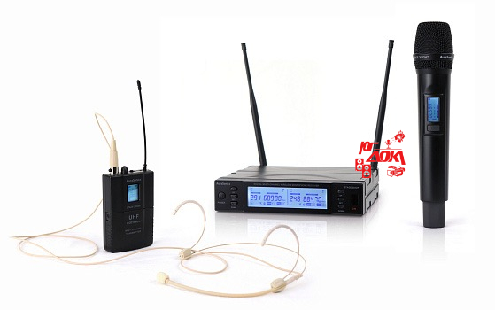 комплект из ручного и поясного передатчиков STAGE 200DHT и STAGE 200DBT c головной гарнитурой и двухканального приёмника STAGE 202DR, радиосистема цифровая, двухканальная, диверситивный приёмник, 660-690МГц, 299 частот, шаг 100кГц, 4DQPSK модуляция