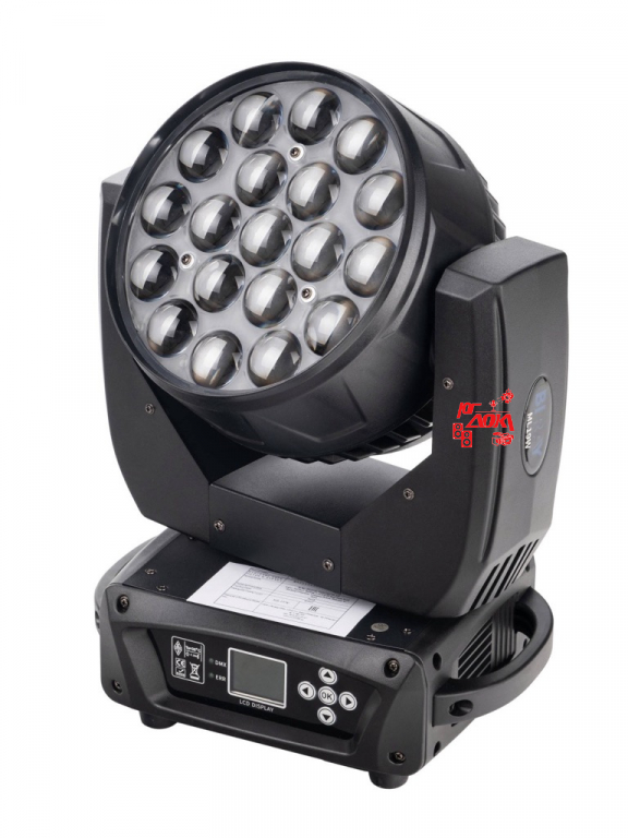 Моторизированная световая "голова", Потребляемая мощность: 350Вт., Источник света: светодиоды 19х15Вт RGBW (4-в-1)., Время наработки: более 50 000 часов., Режимы управления: Авто/Аудио/DMX/Мастер-ведомый., Зум: есть. , Каналы DMX: 16/24., Эффекты: цвет, 4 сменяющихся цвета., Стробоскоп: частота 1-25 вспышек/сек или случайный., 9-60 degree Zoom., Движение: по оси X 540°, по оси Y 270°., Дисплей: ЖК/English., нетто 8.05 кг, брутто 9.57 кг, Размеры: 380х310х460мм.