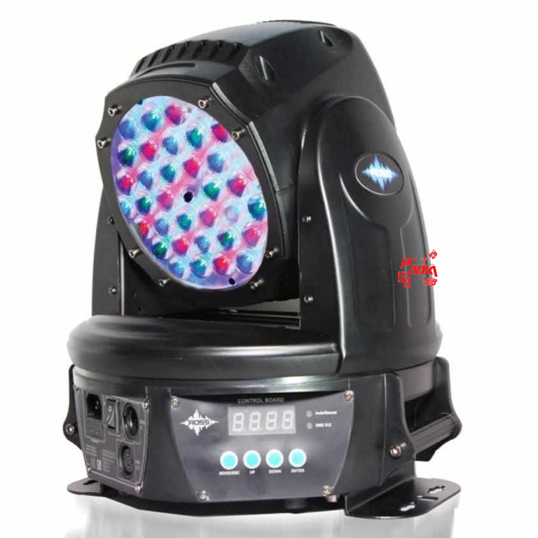 Вращающаяся голова светодиодная RGB 36x5Вт, зум 10°-42°, 16 DMX-каналов, 4 режима работы: DMX-512, авто, звуковая активация и Master/Slave, диммер: 0-100%, панорама: 630°; наклон: 270°, 4-кнопочное светодиодное меню DMX, шаговые двигатели с микрошагом, 3-контактный разъем XLR (In/Out), вентиляторное охлаждение, стробоскопический эффект, потребляемая мощность: 200 Вт макс., 36 высококачественных светодиодов мощностью 5 Вт (4 в 1). Габариты (ДxШxВ): 175*242*315 мм. Вес: 5,7 кг.