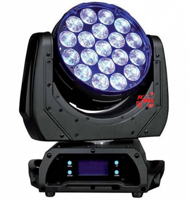 "Поворотная голова" заливного света, 19903 люкс/3 м, сила света 179100 кд., 19*15W RGBW LED чипов Osram, Zoom 8'-40', стробоскоп, эл. диммер 0-100%, DMX-512 10, 21, 8, 21, 34 кан., reset, встроенные программы, Pan: 540° max / Tilt:270° max ,16-bit movement resolution, мощность 350 Вт, 10 кг, 338*270*368 mm
