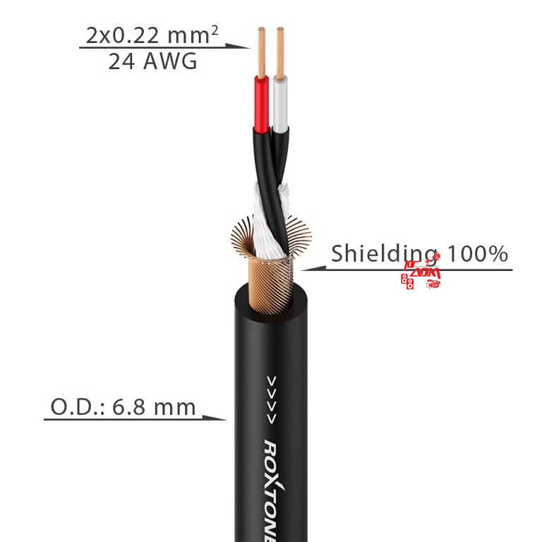 Симметричный микрофонный кабель 2x0,22мм2, из бескислородной меди (100м), 100% экранирование (Спираль из медной проволоки: 80x0,10мм+индивидуальная гальваническая изоляция проводников) D 6,8мм, AWG: 24. Цвет: Черный. Температурный режим эксплуатации: -20/+70